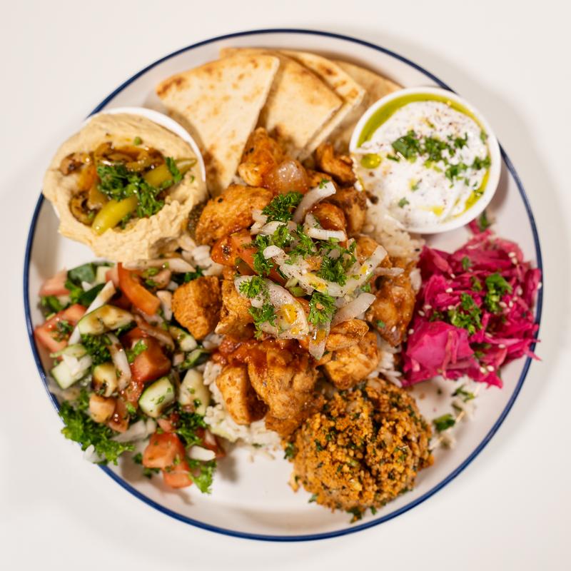 Spring Mix, Turkish Cucumber salad, Tabbouleh, Tzatziki, Hummus, Feta, Baba Ghanoush, Olives, Pickled RedCabbage, Toasted Sesame Seeds, Turco de Gallo, Red Bell Pepper Vinaigrette, Yogurt Sauce & Pita Bread | Pick Your Protein: Chicken Kebab, Gyro, Beef Kebab, Falafel (V) or Roasted Veggies (V) | Add Additional Protein | Add Shrimp | Add Salmon